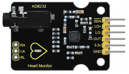 The ECG sensor is an electronic circuit corresponding to the part coming into first contact with the measurement signal after its capture, performing the appropriate basic processing of this signal to later treating it satisfactorily. Typically, an ECG sensor includes the tasks of amplifying and reducing certain noise components. One of the most used ECG sensors is the AD8232 due to its capacity for acquiring the cardiac signal and converting it into a digital signal, and then communication with Arduino can be carried out [28].