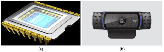 Feng et al. in [32] establish that an image is captured by a device capable of measuring waves located in a certain region of the electromagnetic spectrum and obtaining a useful representation of a given scene. The natural example is the human eye, perceiving wavelengths from 400 to 800 Hz, and other examples are pinhole cameras and cameras with Charge-Coupled Device (CCD) or CMOS (Complementary Metal-Oxide Semiconductor) sensors; see Figure 8a [33].
