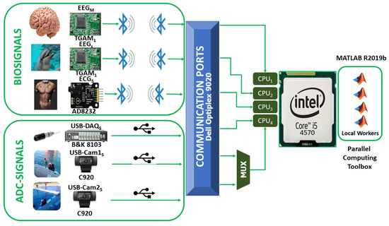 The usage of a computer processor depends on both the amount of information processed and the complexity of the algorithms to be performed in the system. Hence, more sensors, greater the computer computational capacity, leading to more expensive computers [21]. To avoid having many computers processing all the acquired data in a serial way, it is possible to design sets of different managed by a with little computational capacity, and use a specific processor to be able to emulate the capabilities of several computers. Thus, the present work seeks to wirelessly capture EEG neural signals belonging to the same time span using parallel and distributed computing techniques from a Matlab Server R2019b, and thereby support rehabilitation treatments (e.g., Dolphin-Assisted Therapies) for children with neurodevelopmental problems. It is important to mention that computation speed was neither measured nor compared, since the objective of this work has been simultaneous acquisition due to the assignment of a CPU-Core to each connected sensor. Therefore, in this work the brain activity of both living beings is monitored during a Dolphin-Assisted Therapy, fulfilling the objective of achieving a measurement of brain activity. The present work does not pretend to diagnose any disorder, only to measure and obtain results for its analysis from the engineering point of view but not the medical one.