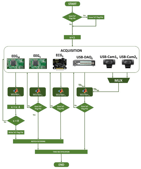 The microprocessor used is the Intel Core i5 4570, with four CPU Cores and up to eight threads of execution can be carried out, belonging to the DELL Optiplex model 9020 system. Moreover, the electrodes (BIOSIGNALS or , , and ) are specially designed for the application during a DAT taking into account the current Official Mexican Standard NOM-135-SEMARNAT-2004, while the USB signal acquisition devices (ADC-SIGNALS or USB-DAQ, USB-Cam1 and USB-Cam2) are configured with the given configuration by the manufacturer. According to Figure 9, the three BIOSIGNALS use each one a CPU-Core exclusively due to the nature of their precision, while the ADC-SIGNALS use a single CPU-core in a multiplexed manner.