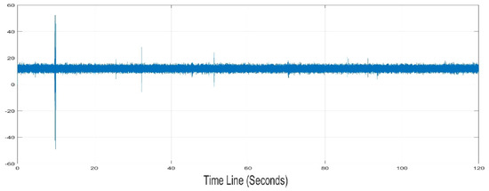 Figure 27a,b show an analysis of the Welch Power Spectrum using a Periodogram to the data acquired by devices and , respectively. This analysis indicates that the power at certain frequencies (at certain time) only takes into account the periods where the connection is stable. Moreover, studying the activity frequency versus power measured in dB only for the samples captured between frequencies from 0 to 60 Hz, minimal samples during disconnection periods are observed, considering in general the signal as valid. For the Device, Figure 27c shows a bandwidth up to 500 Hz; this Spectrogram (in decibels referred to Hertz) indicates that the frequency reached more power. In addition, we can see that the highest power is reached by the frequency of 1 Hz, meaning a patient’s heart rate on average of 60 bpm (beats per minute). So to this electrocardiographic system it can be added parameters to enhance the ECG interpretability such as heart rhythm variability measures, for instance.