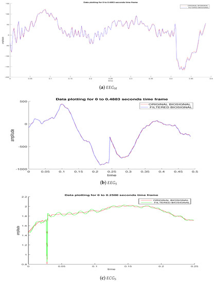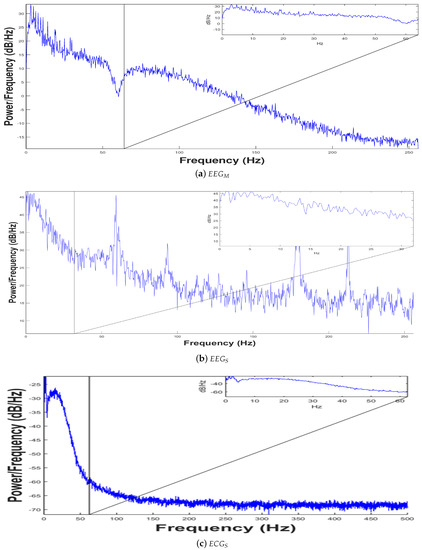 On the one hand, an analysis of biomedical signal interfaces captured after being filtered by a Notch filter shows how the noise of the electrical power line affects both the samples of the and electroencephalographic devices (Figure 26a,b, respectively), as well as the electrocardiographic signal from the device (Figure 26c). For this reason, it can be claimed that a power signal of 110 V/60 Hz significantly affects the acquisition of any biological signal. To obtain a normalized error of 1000/60, a 3 dB Kaiser window is implemented. Furthermore, Figure 26 shows time windows of 0.4883 and 0.25 s for the EEG and ECG sensors, respectively. These window sizes were chosen for illustrative purposes and thereby to show the effects of additive noise from a 60 Hz power line.