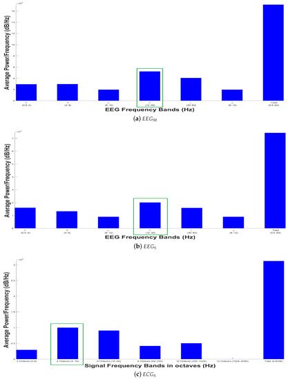 Figure 28a,b show the representation in an Average Spectrogram of the brain activity from the and devices, respectively. From a medical or psychological point of view, in both electroencephalograms the -band is predominant, pointing out an apparent concentration state in both the patient and the dolphin. For the patients, an important change is seen in the attention behavior, while for the dolphins it could be due to familiarization with the device; perhaps the animal concentrates, waiting to receive the order from the coach. Figure 28c shows the Average Spectrogram with a sampling rate of samples per second; in octaves 3 and 4 a greater power in the band is displayed, so the predominant average heart rate of the entire time series ranges from 4 to 16 Hz. In the octaves 11 and 12 no power is obtained because the frequency is about 1024 Hz, exceeding the maximum sampling rate or , according to Nyquist–Shannon sampling theorem.