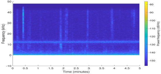 Analysis of USB-DAQ device: Spectrogram of time versus frequency of an underwater acoustic signal.