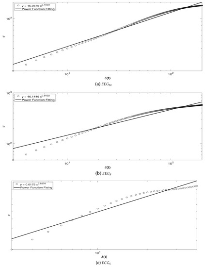Hence, in Figure 30a–c, once the -value increases, the -value also increases (see the Power Function Fit line), since the relationship between and is linear, a positive correlation is displayed. Therefore, each time the fluctuations increase, the dispersion is more stable with respect to the correlation and, as a result, long-term stability is obtained, pointing out both that the sample was taken correctly and that the brain of patient or dolphin have assimilated the environmental information of the initial transitional period, which indicates that the therapy is working in a an initial period of time and then stabilize its long-term efficiency.
