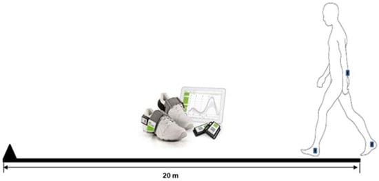 Participants performed various tasks (gait and balance) and, among them, they were instructed to walk 20 m at a self-selected comfortable speed (Figure 1), which was selected for further analysis. An inertial measurement unit (IMU) wearable sensor system (Rehawatch®, Hasomed, Magdeburg, Germany) was attached with Velcro straps at the lower back (L4-L5) and at both ankles (placed laterally, superior to the malleoli) to collect data during walking at a sampling frequency of 100 Hz. The IMU system comprised a 3D accelerometer (range: ±8 g), 3D gyroscope (range: ±2000 °/s) and 3D magnetometer (range: ±1.3 Gs) [,].