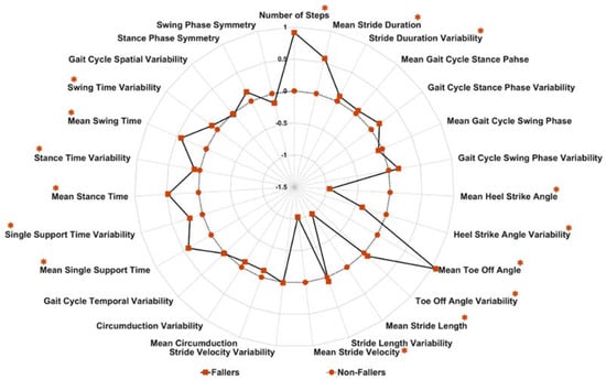 Radar plot indicating the difference between fallers and non-fallers in a range of gait characteristics using z-scores (* indicates significant difference between groups (p-value < 0.05)).
