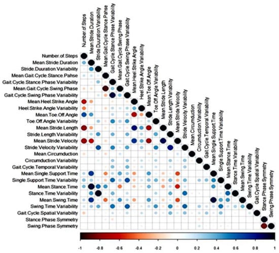 Correlation among the gait characteristics; the bigger the circler, the higher the correlation. Blue means positive correlations and red means negative correlations.