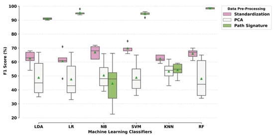 Classification results from each iteration in the 5-fold cross-validation, where the models were trained on 70% data and tested on the remaining 30%, are given in the Appendix A (Table A1 and Table A2). The average results for these 5 iterations are given in Figure 5 and Table 2. The F1 score was used to select the best performing metric based on the imbalanced dataset. Data pre-processing methods affect classification performance. Overall, the path signature method performed better compared to the other methods. ML models such as RF, SVM, LR and linear discriminant analysis performed better as compared to KNN and NB.
