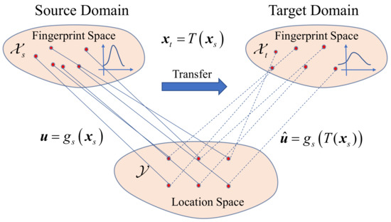 This means that the transformation maintains the information of the position decision function, so the position estimator in the target domain can be approximated by the estimator, g t ( T ( x s ) ) , trained after the source domain is mapped to the target domain, as shown in the schematic diagram in Figure 1. Then, the knowledge about the location recognition function is transferred from the old radio map to the new one.