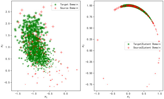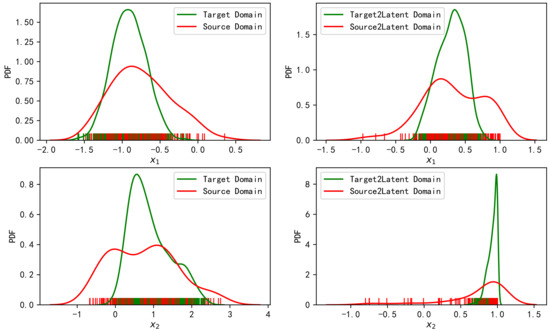 It can be observed from Figure 2 and Figure 3 that TCA transformation fails to match the distributions of the two domains. The samples’ variance in the source domain is large, while it is small in the target domain. This is still the case after mapping to the latent domain. We know that the objective of TCA is to minimize the mean difference of the mapped samples. As the samples have been normalized, the mean difference between the two domains is relatively small. Therefore, TCA does not significantly improve it. As the cost function does not constrain the variance, the variance between the two distributions is still massive after TCA transfer.