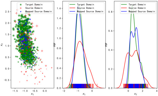 It can be observed from Figure 4 that the samples mapping from the source domain to the target domain with OT have a higher matching degree with the sample distribution in the target domain, whatever the mean, the variance, or the contour. We know that OT is to transport the source domain’s distribution to the distribution of the target domain under the principle of minimum cost, so the two distributions are matched better.