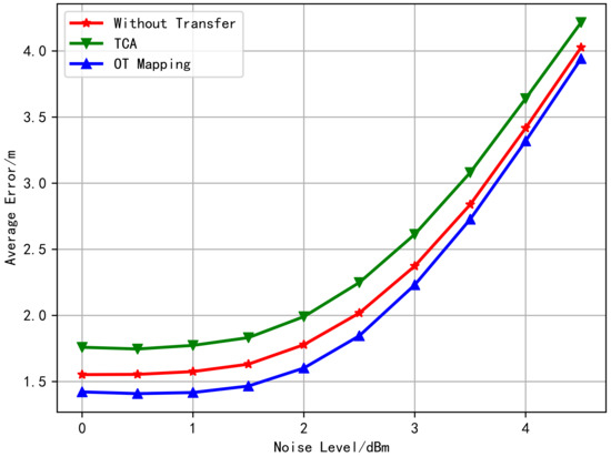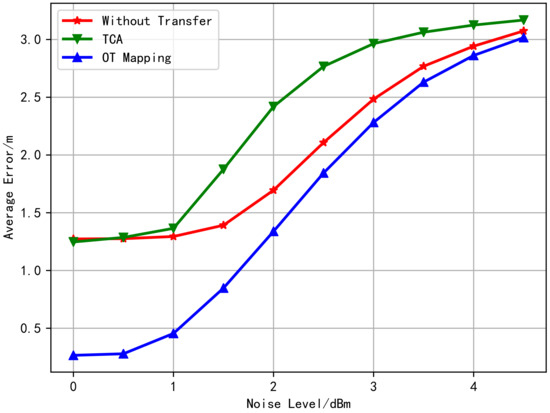 According to the Transfer Learning theory, the generalization error bound of transfer learning is related to the distance between the distributions of the two domains, and the smaller the distance is, the lower bound will be reached [44]. It is observed from the above simulation that the distributions obtained by OT match better than what by TCA. Moreover, Figure 5 shows the relationship between the average test error with changing the noise level without transfer learning, TCA learning, and OT learning. It can be observed from Figure 5 that the transfer performance using OT is the best, and the advantage gradually decreases with the increase of noise level. Besides, TCA does not improve the target domain location performance but rather weakens. From the fitted distribution of Figure 3 and Figure 4, it is obvious that the positioning performance has a great correlation with the degree of distribution coincidence.