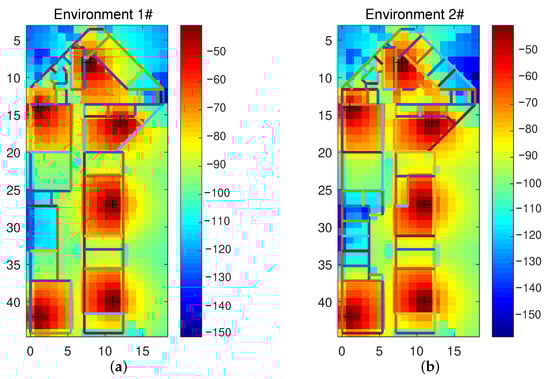 We use the indoor multi-wall model to simulate the transfer learning algorithm’s performance when the local propagation environment changes. Figure 6 shows the heat maps of the power obtained by simulating two environments with 6 APs placed at the same relative locations. Roughly, the two environments have the same layout, and the area is about 50 20 m, but there are fewer walls in Environment 1. The simulation data of Environment 1 are taken as samples in the source domain. Some walls are added in Environment 2 to simulate the local changes compared with Environment 1. The simulation data of Environment 2 is taken as samples in the target domain. In both environments, 7200 fingerprint samples were collected at uniform and the same locations, without noise. It can be observed from Figure 6 that there are some local differences in the power energy due to local layout changes.