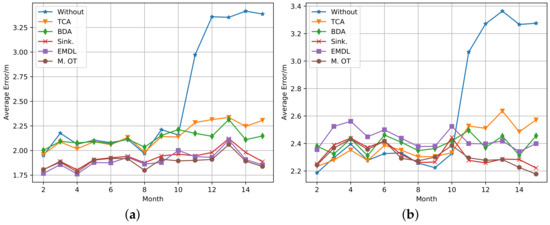 In this section, we use the recent publicly available measured data set [45] to test the performance of transfer learning based on OT and typical feature-based transfer learning algorithms in FL. The data set was collected at the same locations in a library over 15 natural months, using the same device each month. A total of 448 APs were detected in the whole data set. However, due to the long period of sample collection, the number of APs detected every month was different, especially since the 12th month, which had a significant change. In this experiment, the first month’s data were taken as the sample set of the source domain, with a total of 8640 samples. The mean value of 6 samples in a continuous period and at the same location was taken, and 1440 training samples were finally obtained. The remaining data of each month is taken as the target domain sample set, which contains 6 data sets each month: one of them is taken as the validation set, containing 576 samples; 3 of them are taken as the test set 1, containing 1728 samples; the remaining two are taken as the test set 2, containing 1392 samples. This experiment focuses on the time transfer of location fingerprints, namely, training the model with the first month’s data and then using the transfer learning algorithm to transfer the model to the unlabeled samples of the remaining months.