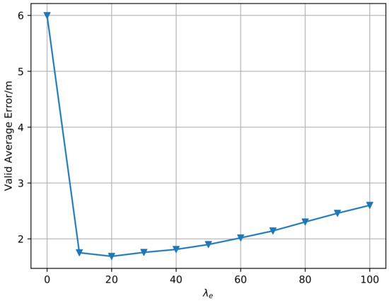In this section, we explain how the super parameters in the algorithm are selected and how they affect the average positioning error. In the Sinkhorn algorithm, there is a super parameter λ e , namely, the entropy regularization coefficient. We empirically select λ e that minimizes the validation error, as shown in Figure 11. For space reasons, we only show the result in the 12th month, still using the 1st month data as the source domain data. It can be seen from the figure that when λ e is set at 0, the error is large, and when it is set at 20, the error reaches the minimum value, indicating that moderate entropy regularization plays a role in improving the performance.