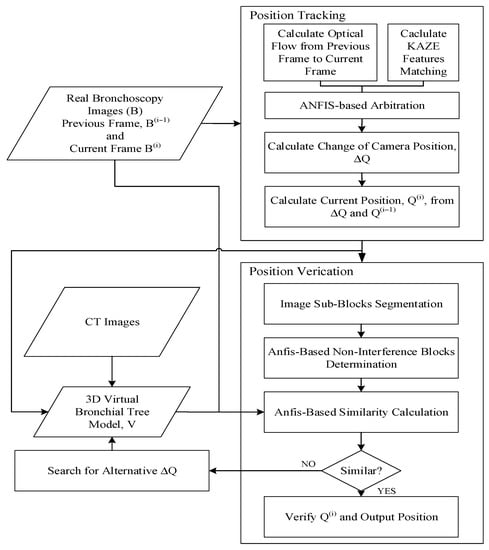 The novelty of this system is that the localization is separated into two phases: tracking and verification. This is done so that the surgeon can quickly determine the current location of the bronchoscope in the virtual model of the trachea while viewing the output from the scope itself, even in the position tracking phase, and if necessary, the actual location will be corrected in the verification phase. The system flowchart of the proposed method is shown below in Figure 1.
