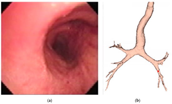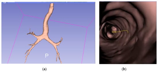 (a) Virtual 3D bronchial model constructed from computed tomography (CT) slices; (b) a sample virtual bronchoscopy image.