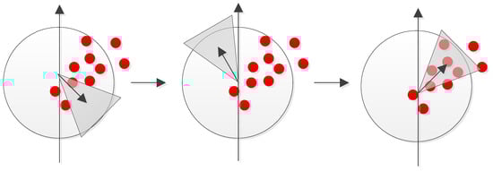 Because square filters are used, the integral images can be used to speed up the calculation. SURF uses a blob detector based on the Hessian matrix to detect the feature points by detecting the changes around the pixels of interest. In order to achieve rotational invariance, the direction of orientation of these pixels of interest must be found. Assuming that σ represents the scale at which a pixel of interest is found, and that the Haar wavelet [] responses in both x and y directions have a radius of 6σ around the feature point, then the dominant orientation is determined by calculating the sum of all responses within a sliding window. The resultant descriptor for each feature point is a description with 64 dimensions. The following figure, Figure 4, shows the search for the dominant orientation.