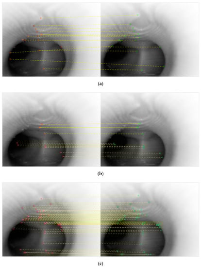The matching results of the three methods: (a) Speed Up of Robust Features (SURF), (b) Maximally Stable Extremal Regions (MSER) and (c) KAZE.
