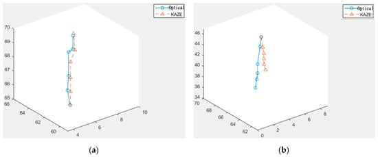Paths calculated using KAZE and optical flow for (a) stable and slow movements and (b) with a sudden movement in the middle.