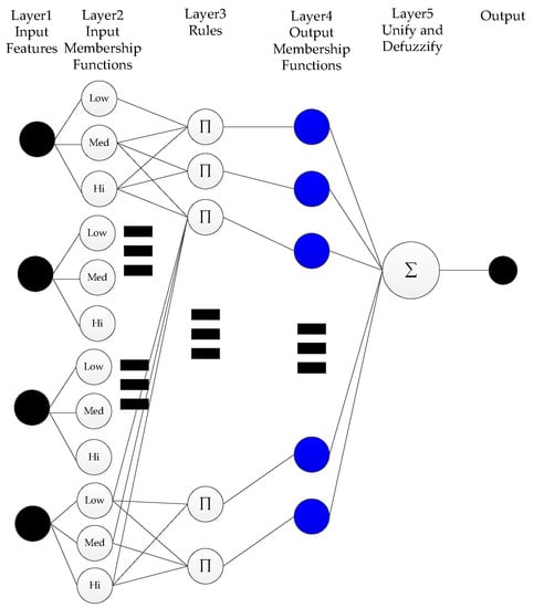 ANFIS is an approach that integrates a fuzzy decision system with the adaptability of a neural network [,]. The general consensus in the published literature is that results from ANFIS are generally better than the standard fuzzy models in most cases [,]. The basic ANFIS architecture with fuzzy membership models for two inputs is shown below in Figure 8; for simplification purposes, not all nodes and connections are drawn. The structure is basically composed of five layers: the first layer is the input features, the second layer is the input fuzzy membership functions, the third layer is simple fuzzy if-then rules, the fourth layer contains the output fuzzy membership functions, and the last layer is simply used to unify and defuzzify the results before the output.