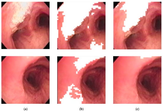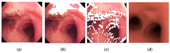 (a) Original bronchoscopy image; (b) detection of reflection-glare sub-blocks; (c) detection of non-uniform sub-blocks; (d) matched virtual bronchoscopy image.