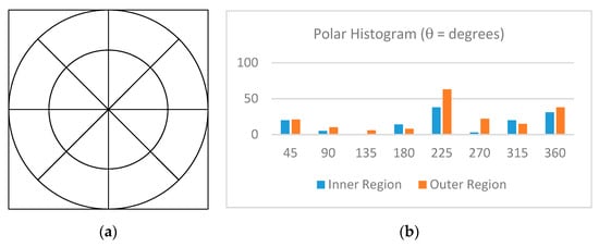 then, the subblock is evenly divided into 16 polar regions, as shown in Figure 12a. Then, the number of important subblocks in each region is summed into a histogram as shown in Figure 12b.