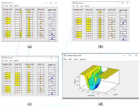 The ANFIS systems mentioned above use triangular fuzzy memberships, and Figure 13 shows sample fuzzy rules for the determination of blocks with high reflectance, the importance of blocks and the similarity of their shape context. Input 4 in the fuzzy rules represents the memberships of the shape context value, and output 1 in each figure is simply the degree to which the result would be considered as highly reflective, important or similar, respectively. The relationship between the importance of blocks vs. similarity of shape context is also shown in the 3D plot.