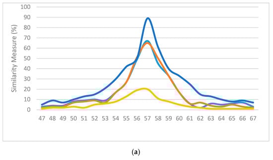 For subjective evaluation, the similarity measurements of various frames using different methods was compared; the higher the value, the better the match. Figure 17 displays the similarity measures of the above methods used on three random frames from three separate sequences. The blue lines represent the results of the proposed method. It can be observed from the illustrations in Figure 17 that our method had the highest probability of finding the correct location of the bronchoscope and displaying it on the virtual 3D model of the trachea compared to the other methods used in the comparison.