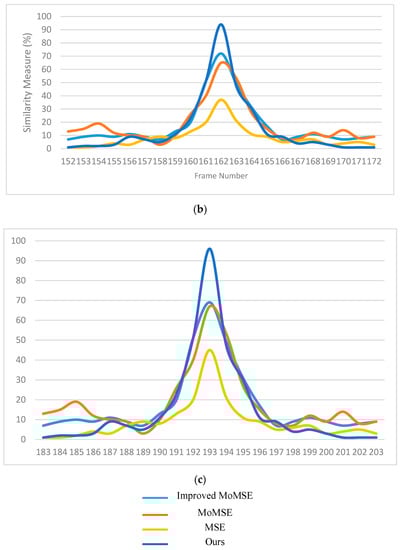 Normalized similarity measures (higher is better) of (a) the 57th frame of sequence #1, (b) the 162nd frame of sequence #2 and (c) the 193rd frame from sequence #3.