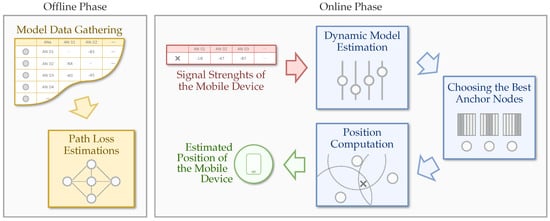 In this section, we present our proposed PoDME architecture. Figure 1 shows the components of our system. In the offline phase, we performed model data gathering and obtained the path loss estimates between the anchor nodes. In the online phase, we perform the position computation using the RSSI values, choosing the best anchor nodes, and using the path loss estimates obtained in the offline phase to improve the distance mapping between the mobile device and the anchor nodes. All of these components are detailed in the next sections.