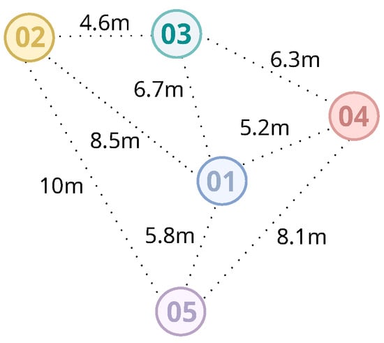 where is the path loss exponent between Anchor and Anchor, is the RSSI between them, as shown in Table 1 and, finally, is the distance between them, as in Equation (1). Please note that we ignored the parameter , since is an averaged value from several samples.