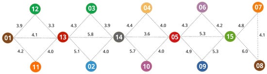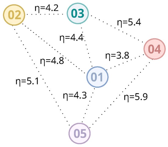 Therefore, we can estimate all of the path loss exponents in the scenario based on the distance and RSSIs among anchors. A higher would indicate a higher number of obstacles and other fading factors between Anchor and Anchor, while two anchors with direct visibility from each other would result in a lower path loss exponent. Figure 3 and Table 2 show examples of path loss exponents for the values in Figure 2 and Table 1. It is worth noting how these values change from one anchor node to another. When we establish the path loss exponent between two anchor nodes, we are characterizing the signal behavior in the region in which they are located, based on their respective positions on the map. Thus, when a mobile device sends a packet and has the signal strengths collected, the distance estimation is made using the respective values of path loss exponents between the nearest anchors.
