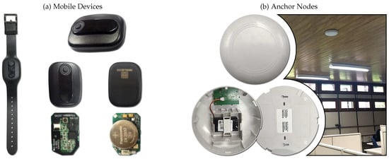 Testbed hardware: (a) mobile devices with Bluetooth communication; and (b) anchor nodes with Bluetooth and 900 Mhz communication (front, opened, back, and installed on the ceiling).