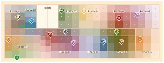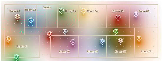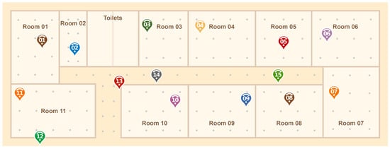 To evaluate the performance of our proposed IPS solution, we carried out a large-scale experiment in a 43 × 15 m² area composed of 15 spaces (11 rooms and 3 halls), as shown in Figure 5. To cover the whole area, we deployed 15 anchor nodes fixed on the ceiling of the rooms in locations where it was somewhat convenient to connect them to the mains supply. It is important to note that to perform our Model Data Gathering, explained in Section 3.1, we used 8 different mobile devices and collected samples at 15 different locations. This was done to estimate the path loss exponents among anchors with a variety of signals from different devices.