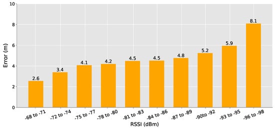 Positioning error by average RSSI. The farther the anchor nodes, the higher the positioning error. Even slightly farther anchor nodes can increase the positioning error by almost 1 m.