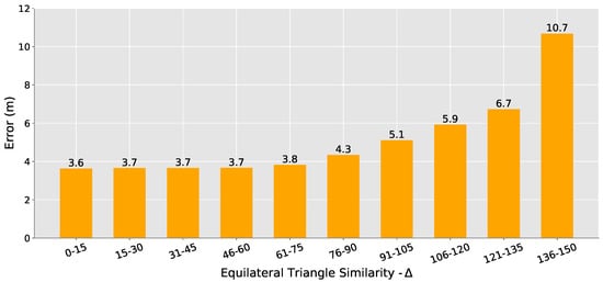 Another key aspect of Choosing the Best Anchors is the equilateral triangle similarity checker, the ∆ shown in Equation (7). As mentioned, we noticed that even for closer anchors, when their positions were somewhat collinear, it resulted in considerably higher errors. Again, to better understand the impact of the anchors choice based on this criterion, for each sample to be located in our experiment, we computed the device’s position using all possible combinations of 3 anchors. For each computed position, we saved the positioning error and our equilateral triangle similarity (∆).