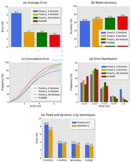 To evaluate the impact of the value used as the path loss exponent, in Figure 11e, we can see the average positioning error in relation to the use of a fixed path loss exponent value or the use of our proposed dynamic value. These results show that our proposed dynamic model was able to improve the accuracy of all evaluated variations of anchor choice. We can also see that our proposed PoDME solution takes advantage of not only the dynamic model but also the anchors choice, i.e., both aspects are responsible for improving the accuracy of the solution.