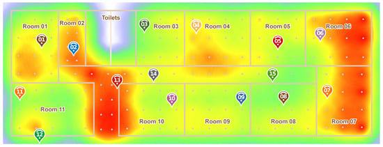 Finally, in order to better visualize the data in Table 3, Figure 12 shows a heatmap of the errors in the whole scenario. Darker red colors indicate the areas with the highest errors. In this heatmap, we can notice another problematic region of the scenario, which is the hall near Anchor. In this area, especially towards the bottom of the map, the other anchors (besides 13), are far from the hall which, combined with the walls in the area, resulted in a worse performance. This lack of anchors coverage can also be noticed in Figure 7.