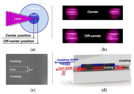 The investigated FBG was inscribed in standard Nufern SMF-28 fiber using the classic phase mask technique. The femtosecond laser used was generated by a Ti:sapphire regenerative amplifier system (Spectra-Physics, Solstice, Santa Clara, CA, USA), which emits a pulse width of 100 fs and output pulse energy of 4 mJ with linearly polarized light at a central wavelength of 800 nm. The pulse energy can be adjusted via rotation of a half-wave plate followed by a Glan polarizer. The laser beam was focused into the fiber by a cylindrical lens with a 15.5 mm focal distance that was mounted on a two-dimensional stage with a resolution of 10 μm for adjusting the position. To observe the fiber position, we set up a microscope over the inscription stage. A uniform phase mask (Ibsen Photonics, Farum, Denmark) with zero-order diffraction efficiency below 4% and grating pitch of 2120 nm was positioned between the fiber and lens. The mask was positioned approximately 300 μm from the fiber for high RI modification efficiency to ensure the narrowest focused laser line and highest peak intensity in the focus [31]. In particular, the laser was not focused in the center of the fiber but in the interface between the core and cladding, as shown in Figure 1a. The focused position inside the fiber can be estimated via observing the laser diffraction pattern after passing through the fiber core, see Figure 1b. When the laser beam focus position is in the core center, the middle zero-order diffraction fringe is strong. However, the zero-order diffraction fringe will gradually weaken when the laser beam focus position is off-center. Therefore, we can use the diffraction pattern as the criterion for the focus position. High intensity femtosecond laser modification is a process of energy deposition in materials, which can result in complex modification (strong RI change and material damage) and significant propagation loss. The laser exposure parameters must be appropriate for grating inscription. With a high pulse energy of 0.8 mJ and exposure duration of 30 s, a highly RI-modified region can be formed in both the core and cladding [20,22], as shown in the photomicrograph in Figure 1c. The strong RI modification enhances the coupling of the core mode to the cladding modes. A special FBG with a wide range and comb with continuous cladding mode resonances (defined as a cladding mode FBG, CMFBG) can be achieved with this modification. Although transmission achieves a similar result to that of a TFBG [11] or an eccentric point by point (PbP) grating [32,33], it is superior to these two. Exciting cladding modes without a specialized/tilted mask is important because a tilted mask costs significantly more than a uniform mask. In addition, the PbP technique requires careful alignment and precision.