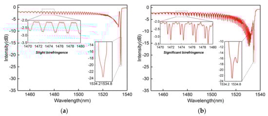 The grating region will break the cylindrical symmetry of the fiber and predictably result in the birefringence effect. A common FBG was inscribed with the normal focused laser condition to verify the focused laser exposure position effect. As shown by the spectral response in Figure 2a, the cladding mode resonances are obtained in the short wavelength side. The high intensity laser pulse introduces a slight birefringence in the fiber material, so the cladding mode peaks are slightly split into two peaks; see inset of Figure 2a. However, the localized grating-induced birefringence offers a strong polarization-dependence in this work, and the core mode and cladding modes are significantly split into two peaks. These two core mode resonances are separated by 270 pm, corresponding to a birefringence value of approximately 2.6 × 10−4. The comparable cladding mode spectral response can be observed in the high-order cladding mode [34] and the large angle TFBG [25]. In contrast to the common FBG, the cladding modes are significantly improved, particularly for the low-order modes, as shown by the spectral response in Figure 2b. Each cladding mode has a one-to-one related effective RI value and will vanish when the surround RI is close to or beyond that value [11,12]. Thus, the spectral range is an important property for cladding mode-based sensors, and the broader-range cladding mode comb has a wider measurement range.