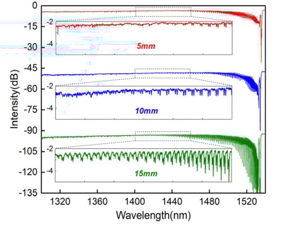 To further improve the cladding mode range, we studied the effect of the grating length on the spectral response. The grating length was controlled by the phase mask scanning method. Generally, a longer grating length with the same RI modification provides stronger reflectivity, and weak cladding modes can be further enhanced. Figure 3 shows the evolution of transmitted spectra (grating lengths are 5, 10, and 15 mm). According to the results, the grating length effectively enhances the core-to-cladding mode coupling, and the peak-to-peak amplitude and spectral range of the cladding mode resonances are gradually improved with increasing grating length.