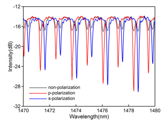 To characterize the polarization dependence of the CMFBG, an in-line polarizer and a polarization controller (PC) were placed in front of the CMFBG. The polarization state of the light shone on the CMFBG can be changed by the PC. We used a 15 mm CMFBG as an example. Figure 4 shows the magnified transmission spectrum of the low-order cladding modes from 1470 to 1480 nm. The attenuations of cladding mode doublets are almost the same when the light is orthogonally polarized. Using the appropriate polarized light, the doublets present a suppressed or strengthened trend. Here, one of the peaks reaches maximum transmission intensity, whereas another almost disappears in the transmission. The polarization dependence benefits from strong coupling between the core mode and azimuthal cladding modes, which is induced by the asymmetric RI modification [11,21].