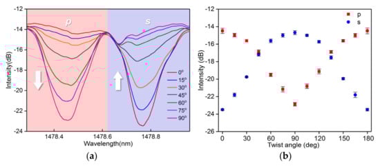 (a) spectral response to the fiber twist around 1478.6 nm; (b) intensity variation of p- and s-polarized states.