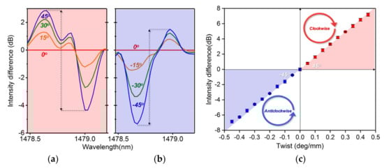 Notably, the magnitudes of the variation of the two polarizations due to the angle change are different. They are more sensitive when the orientation of the grating planes is close to the field vector, and the intensity responses are not linear; see Figure 6b. However, we can observe that the intensity variations of the two polarizations for each step increase in the angle are approximately equal from the red and blue zone in Figure 6a (corresponding to p- and s-polarization, respectively). Therefore, we set the case that p-polarization is equal to s-polarization as the standard state, and applied the difference disposal to the spectral response; see Figure 7a,b. The peak-to-peak intensity of the differential spectrum between the p- and s-polarized resonances is zero at a twist angle of 0°. The twisted fiber length is 100 mm, and the sensitivity is dependent on the fiber length. So the sensor presents a positive variation trend with a great linear sensitivity of 16.2 dB/deg∙mm when increasing the twist angle from 0° to 45° (clockwise), while it presents a negative variation trend with a great linear sensitivity of −15.3 dB/deg∙mm when decreasing the twist angle from 0° to −45° (anticlockwise), as shown in Figure 7c. This intensity response characteristic provides a direction recognition mechanism for the vector twist (positive variation for clockwise, negative variation for anticlockwise).