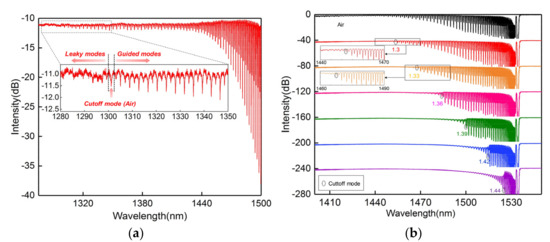 (a) Transmission in the air (effective refractive index (RI) ~ 1000); (b) spectral responses to different RI solutions; inset: magnified spectrum around the cutoff mode.