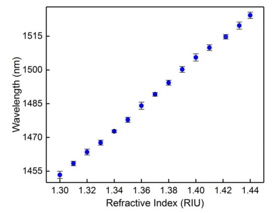 We used a 15 mm CMFBG for the surround RI measurement; the cladding mode comb in the short wavelength side is shown in Figure 8a. The input light is s-polarized to facilitate the spectral analysis. We can observe that the cladding mode is continuous and the cutoff is around 1301 nm from the insert because the effective RI of the cladding mode here is estimated to be 1.0 (effective RI of air). The cutoff mode is the boundary between the guided modes and leaky modes. Thus, a portion of the cladding modes located at the short wavelength side of the cutoff mode vanish as the RI increases, and are transformed into leaky modes. A series of RI-matching fluids ranging from 1.33 to 1.44 were prepared as samples. For consecutive tests, the entire grating region was immersed in fluid, and cleaned with alcohol after each measurement. The sensing spectrum was restored to its original state after cleaning. The spectral responses of the CMFBG produced to surround the RI are demonstrated in Figure 8b. The intensities of the guided modes were not changed with the external RI, and maintain their original spectral characteristic. However, the transformed leaky modes will weaken relative to their original state, or even vanish, as shown by the spectral evolutions in Figure 8b. Therefore, the boundary (cutoff mode) between the guided modes and leaky modes, which gradually shifts to the long wavelength side, is a criterion for RI measurement. We plotted the wavelength for the cutoff mode as a function of the surround RI with a linear sensitivity of 510.95 nm/RIU, as shown in Figure 9.