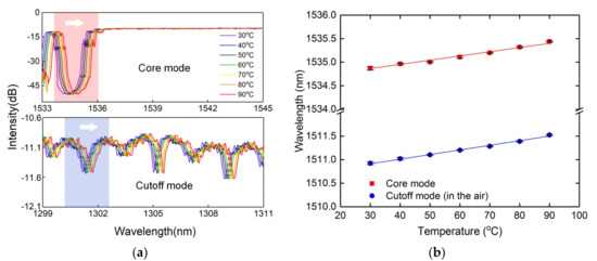 The thermal property of the CMFBG was also characterized. To facilitate the analysis, the default input light in temperature measurement is still s-polarized. The CMFBG was placed inside a temperature box with a resolution of 0.1 °C. The temperature increased with a step of 10 °C, and was maintained for five minutes to ensure the evenness of the temperature in the box. As the temperature increased, the overall spectrum responses showed wavelength shifting without significant fluctuation in intensity, as the spectral responses of core mode and cutoff mode in Figure 10a. We plotted the wavelength of the core mode and cutoff mode as a function of temperature with a sensitivity of 9.3 pm/°C and 8.7 pm/°C, as shown in Figure 10b. Thus, the proposed CMFBG has the potential for multi-parameter sensing.