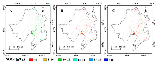 Spatial patterns of the predicted wetland soil organic carbon concentration (SOCc) at different depths: (A) 0–30, (B) 30–60, and (C) 60–100 cm.